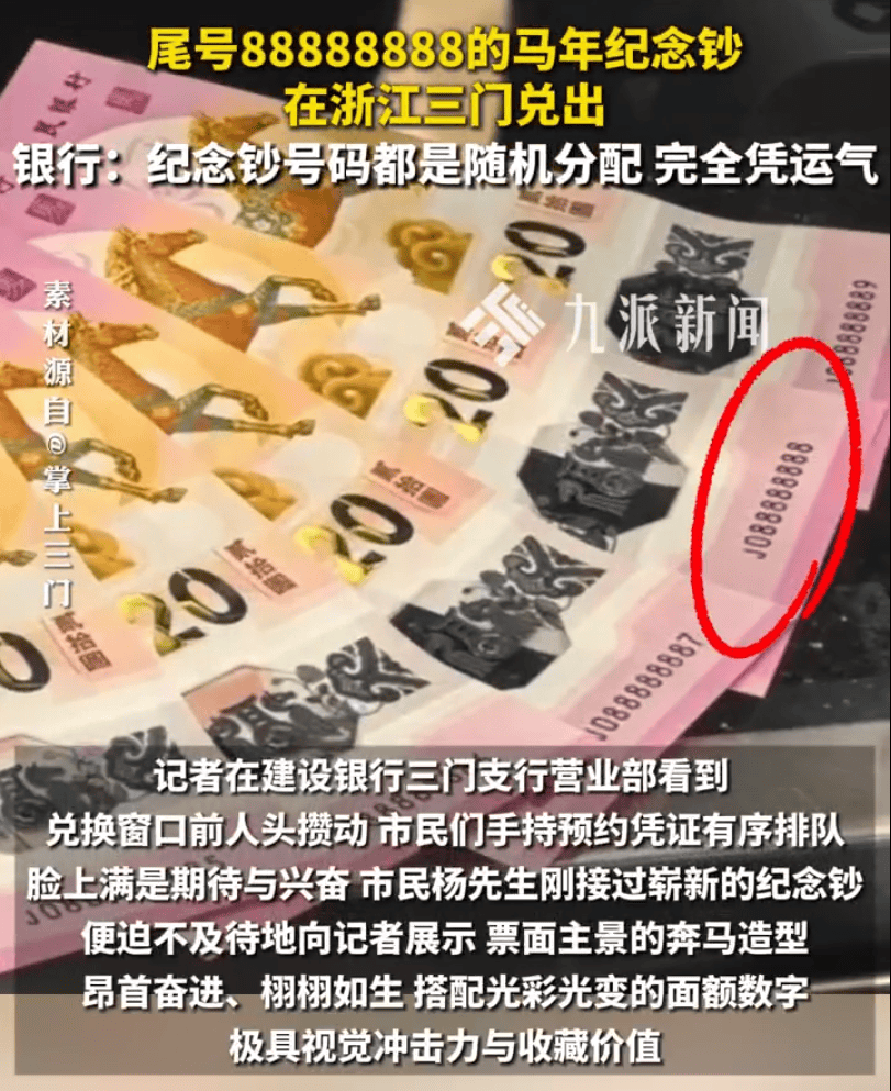 ●浙江一市民领到尾号88888888马年纪念钞,银行回应:号码都是随机分配,全程没有人为干预,完全凭运气。
