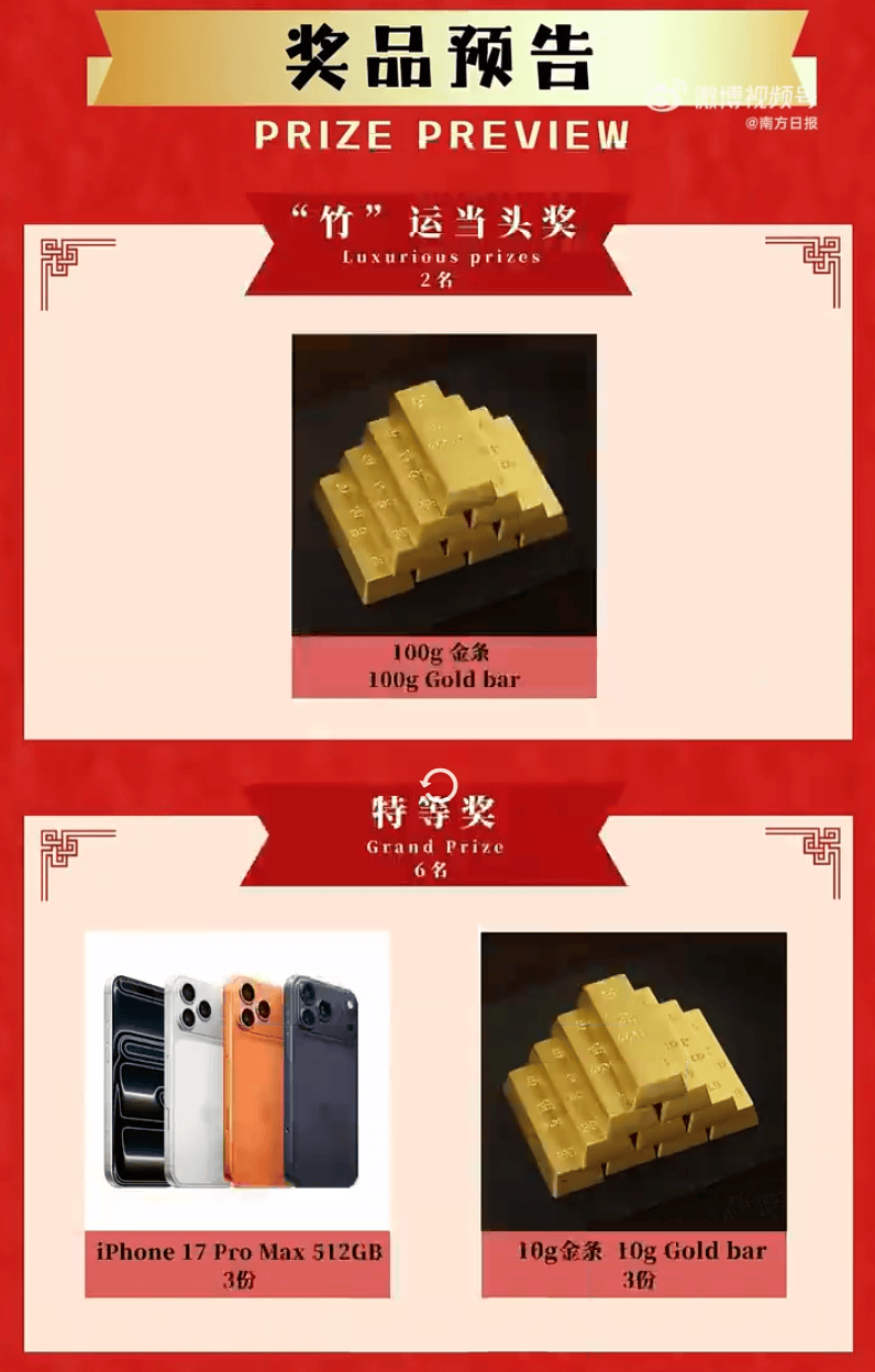 ● 深圳一科技公司年会抽奖,最高奖2名,每人100克大金条,特等奖苹果17手机配10克金条,一等奖华为旗舰加200克银条。